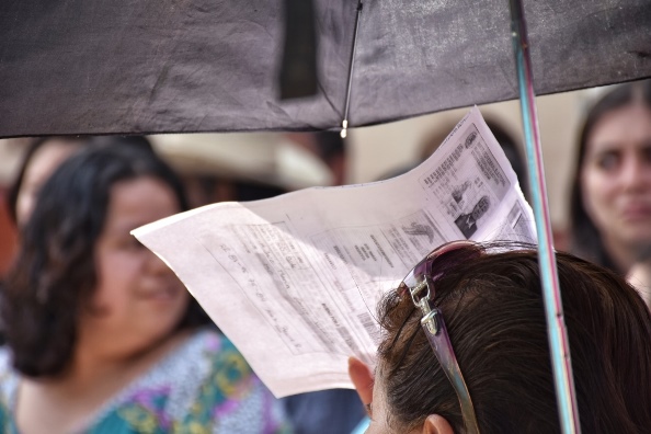 A unos 15 metros de distancia, se ve uno de los organizadores; viste una camisa de la Universidad Popular Autónoma de Veracruz, (UPAV). Con un altavoz, ordena a la multitud, luego hace señas a una persona y le dice que avance. “Ya sabes el procedimiento; échame tu acta de nacimiento, tu CURP, comprobante de domicilio y te tomamos la foto. Ya después pasas con el compañero de la otra cuadra.