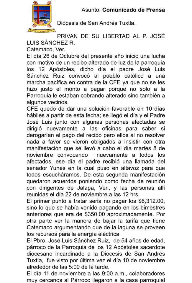 La Diócesis dio a conocer la desaparición, de forma violenta, del padre José Luis Sánchez Ruiz, de 54 años, párroco de la Parroquia Los Doce Apóstoles, de Catemaco.