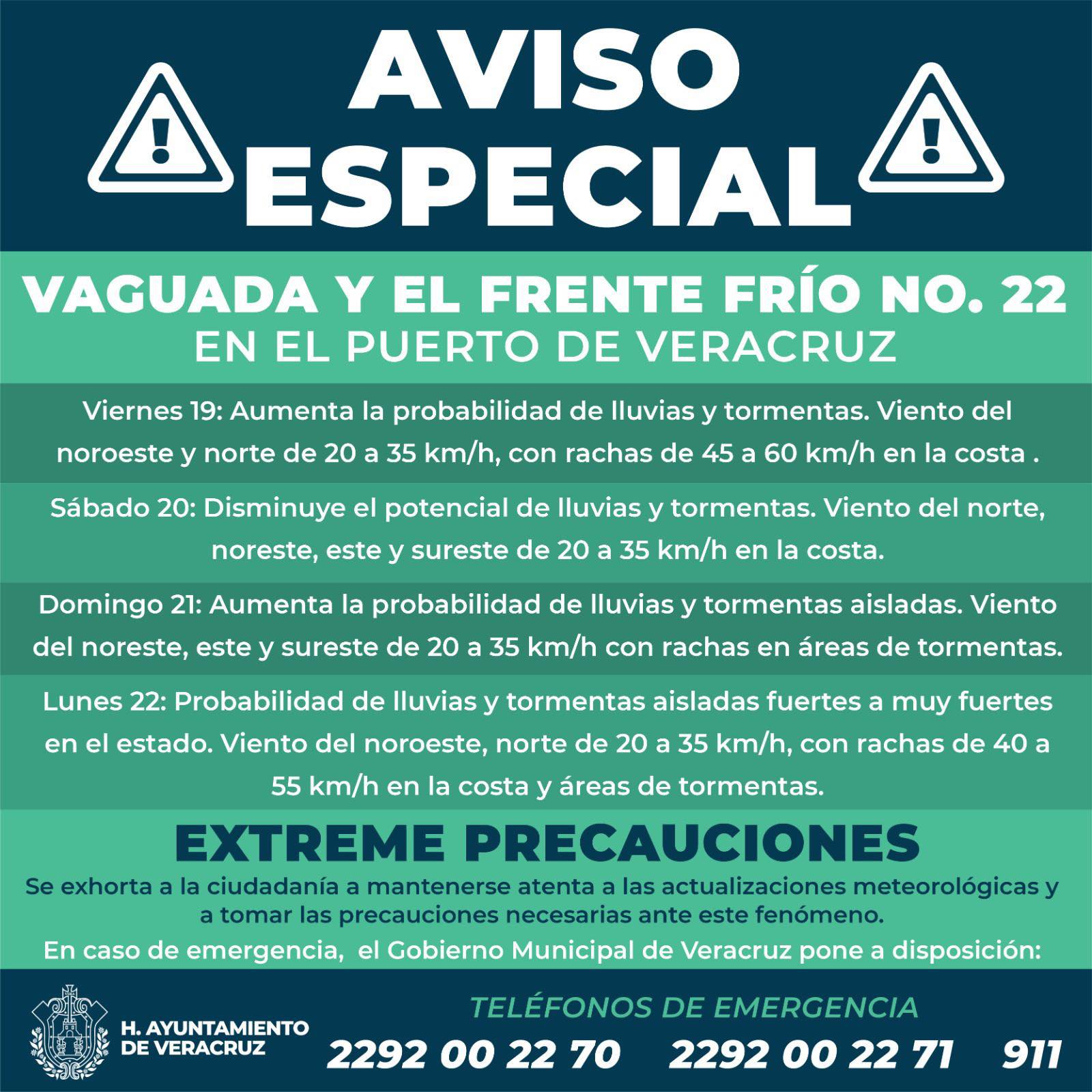 El Gobierno Municipal de Veracruz, a través de la Unidad de Protección Civil, informa sobre el Aviso Especial ante la interacción de una vaguada establecida sobre el suroeste...