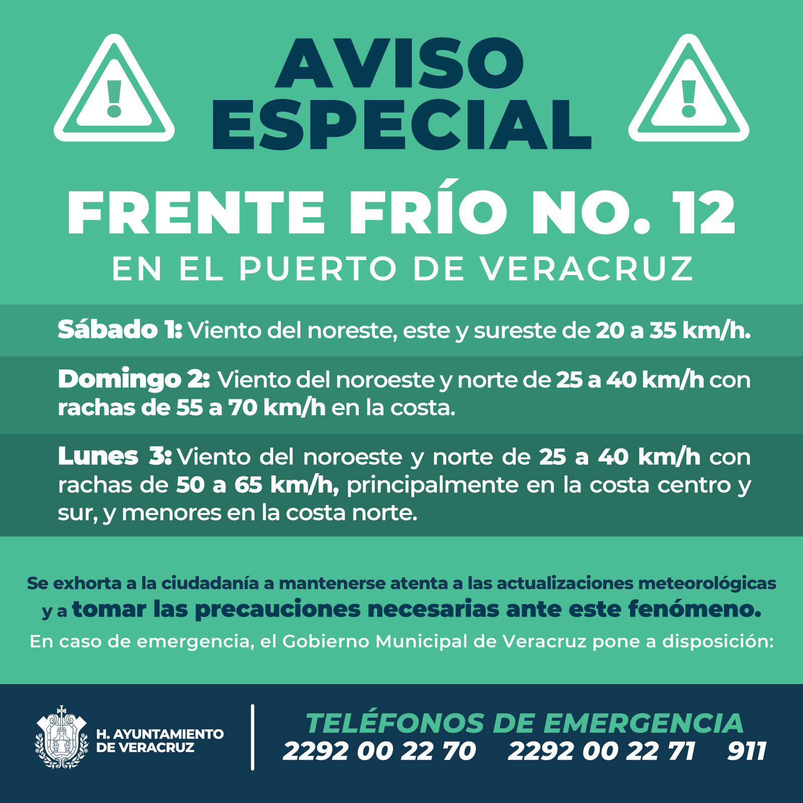 En caso de emergencia, el Gobierno Municipal de Veracruz pone a disposición de la población los siguientes teléfonos: 2292002270, 2292002271 y el 911.
