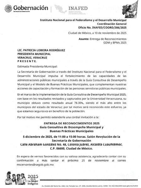 del Instituto Nacional para el Federalismo y el Desarrollo Municipal (INAFED) por haber obtenido el más alto puntaje en el estado de Veracruz dentro de la Guía Consultiva de Desempeño Municipal (GDM) 2025, con una calificación de 78.30%.